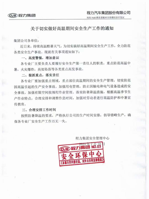 程力集团“关于切实做好高温期间安全生产工作的通知”公示如下 近日来,持续高温酷暑天气,为切实搞好高温期间安全生产工作,全力防范各类安全生产事故。现将有关事项通知如下: 程力集团“关于切实做好高温期间安全生产工作的通