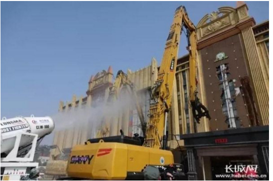 2018年5月8日上午,“因雄安新区建设需要,河北容城一家酒店被绿色拆除”此次拆除行动采用的绿色高科技拆除技术除了拆的快之外,还用绿色和环保创造了全新的“雄安质量”。湖北程力专用汽车股份有限公司的程力抑尘车间的雾炮车此次是大显伸手,成为本次拆迁除尘,降尘的第一保卫卫士。