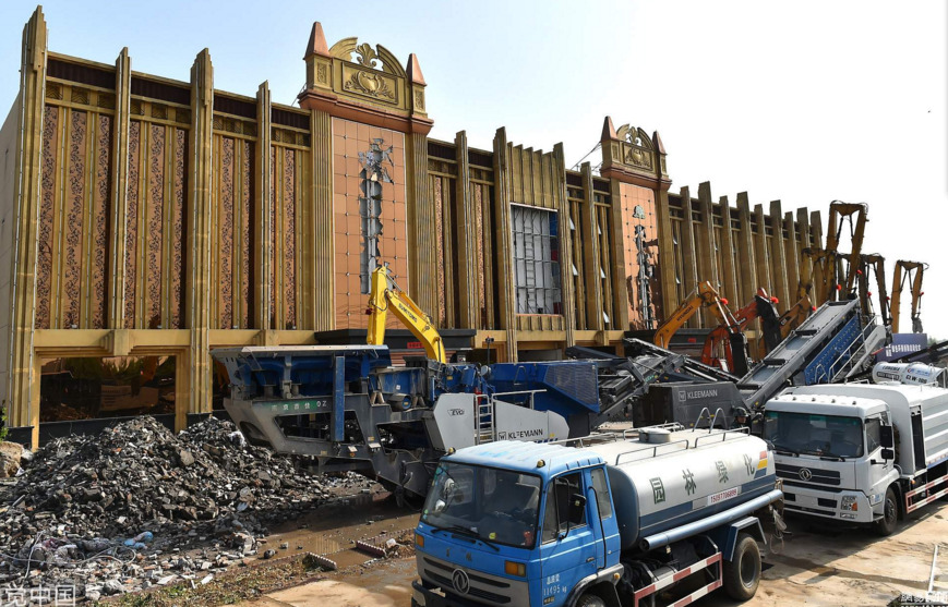 一台台大型机械对现场拆除产生的建筑废料进行加工,产出再生混凝土、再生砌块、再生砂浆、再生路基及砖块等绿色建材,确保拆除过程中不生产建筑垃圾,拆除后产生的约13000吨建筑垃圾将100%循环再生利用。