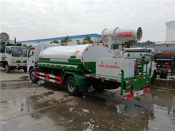 该车多功能雾炮车水箱可盛水8吨,本身具备洒水车功能,不同之处就是安装在车体后半部分的远距离喷雾系统,又称“雾炮”。该系统可以俯仰和水平旋转180度,筒口安装有数十个喷水口,其工作原理是在液泵喷水后, 通过调节风压改变喷雾的薄厚程度,整套系统采用车载式发动机组自供电源,可实现驾驶室或远程遥控控制。