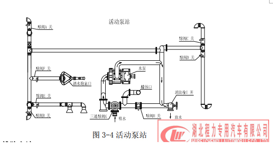 (4)活动泵站 做活动泵站时,其操作程序是:在三通球阀 G 处接一胶管,调节三通球阀 G 到如图位 置(注意:三通球阀凹坑所对方向关闭),关闭不锈钢球阀 A、B、C、D、E、F 和铝合金球阀 H,打开栓 I,接出口管。踏下离合,打开取力器开关,慢慢松开离合(千万不可过快, 否则将会损坏取力器或变速箱),使水泵开始工作,即可实现活动泵站的功能,停止工作后开 关回位。 工作水路示意:水经过三通球阀 G、过滤网、泵、栓 I。(其中 A、B、C、D、E、F、 H 关闭)。