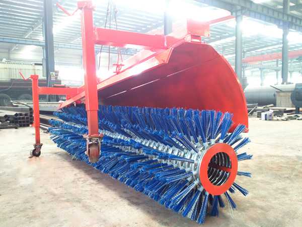 推置式雪滚选用装载机液压动力,将液压动力经管道由控制元件(集成阀)分配到执行元件(大扭矩液压马达和液压缸),从而带动雪滚高速运转工作。通过装载机驾驶室的左右按钮来调节刷子左右摆动,通过调节小臂操纵杆来调节刷子旋转(刷子只允许正转、不能倒转)。雪滚开启前检查外观和各紧固件、液压元件是否正常,工作时通过装载机驾驶室的左右按钮来调节刷子左右摆动。启动装载机液压动力,带动液压泵旋转进行工作,通过液压泵把液压油送进液压阀中,开启左右摆动液压缸使其角度达到使用要求(一般为30o~35o),启动上下液压缸调整雪刷与地面相接触,开启马达控制开关使雪刷旋转,然后装载机行驶达到清扫目的。